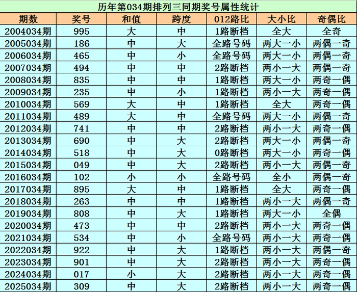 历史上第2026034期排列三已开出22期奖号了,历年同期奖号分别为:995、186、465、494、835、235、569、489、741、690、518、049、102、895、263、808、473、534、922、901、017、309,详细统计见下表: