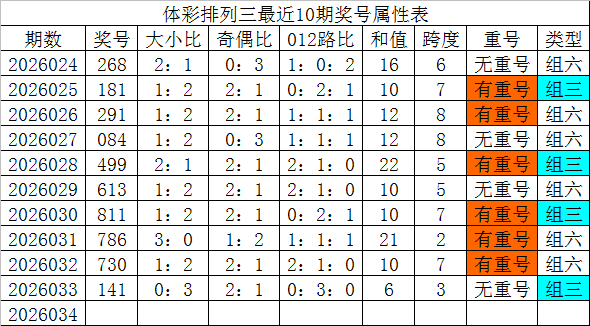 体彩排列三最近10期分别开出奖号:268、181、291、084、499、613、811、786、730、141,各奖号属性详见下表: