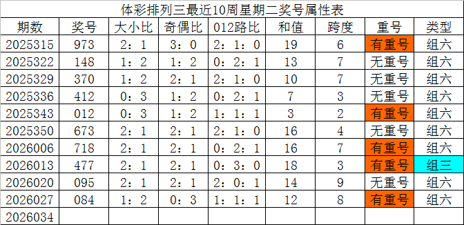 体彩排列三最近10周星期二奖号分别为:973、148、370、412、012、673、718、477、095、084,各奖号属性详见下表: