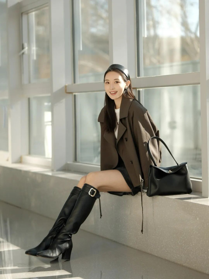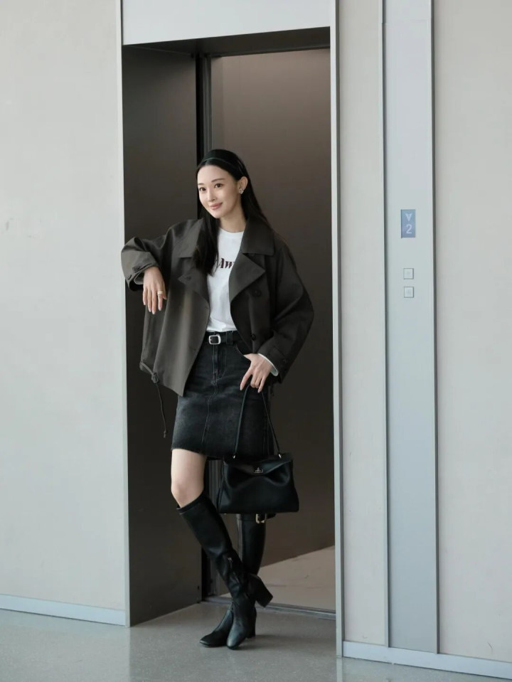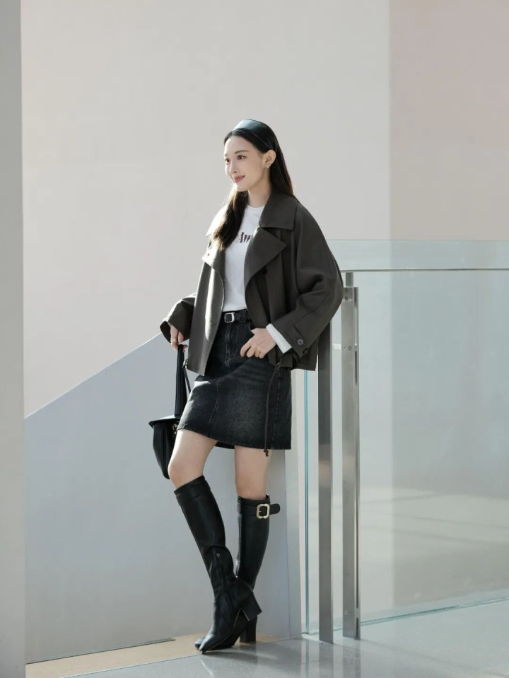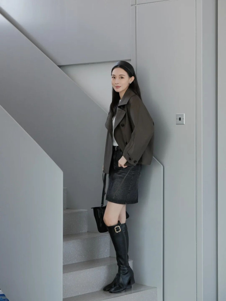 米兰app官网 短款风衣+半裙+高筒靴, 显瘦显高的早春通勤穿搭