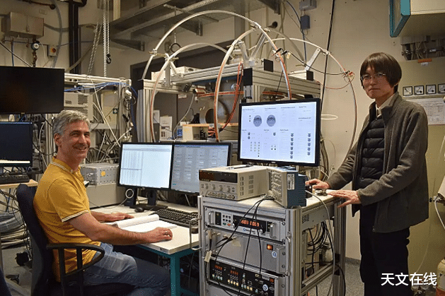 这是最先进的自主研发的实验室光谱仪。MPE的科学家Christian Endres和Mitsunori Araki(右)精心策划了这项实验:一个驱动新分子的产生,而另一个通过精确光谱学捕获其特征。照片的中心是一个巨大的真空室——一个新分子诞生并立即被测量的舞台。图片来源:MPE。