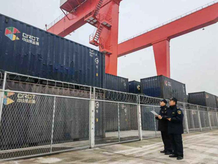 重庆海关所属西永海关关员保障重庆首票出口海铁多式联运货物顺利发运。重庆海关供图