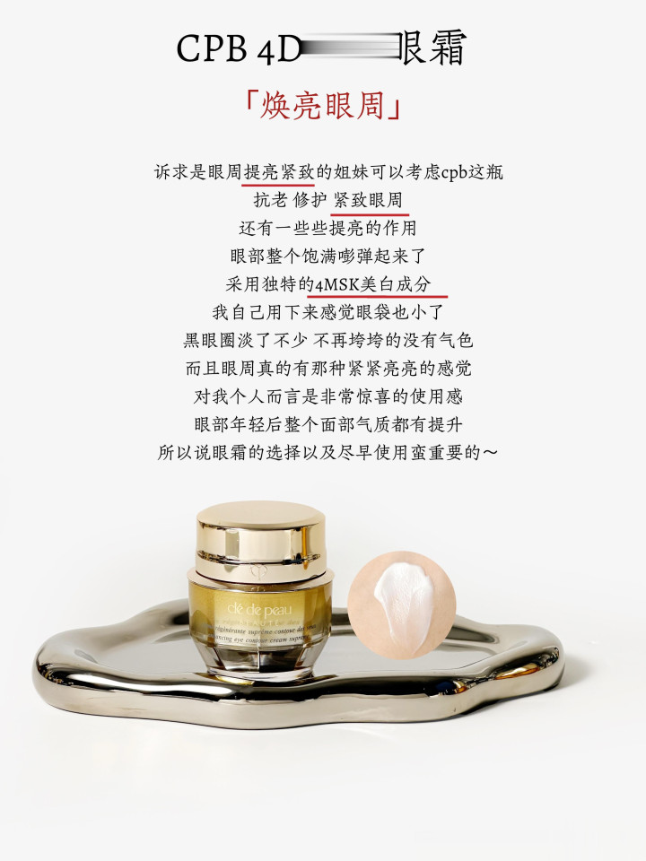 是以说,这款眼霜关于眼部肌肤的问题,除了淡纹、紧致,让眼部肌肤满盈,我认为最大的亮点,还在于淡化黑眼霜、脂肪粒,包括还有红血丝、促进伤口愈合,确立眼部肌肤挫伤等等,可爱的可以试试。