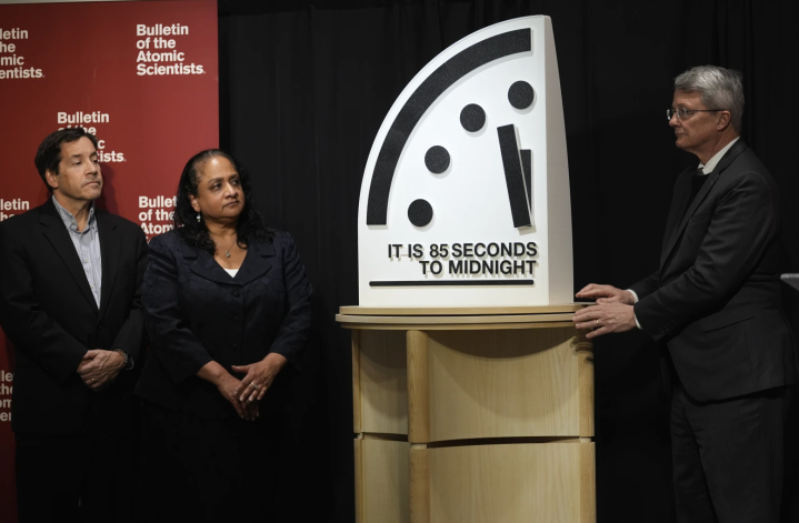 当地时间1月27日,知名期刊《原子科学家公报》的科学家宣布,将名为“末日时钟”的象征性时钟往前推进4秒,设置为午夜前85秒,即理论上的湮灭点。