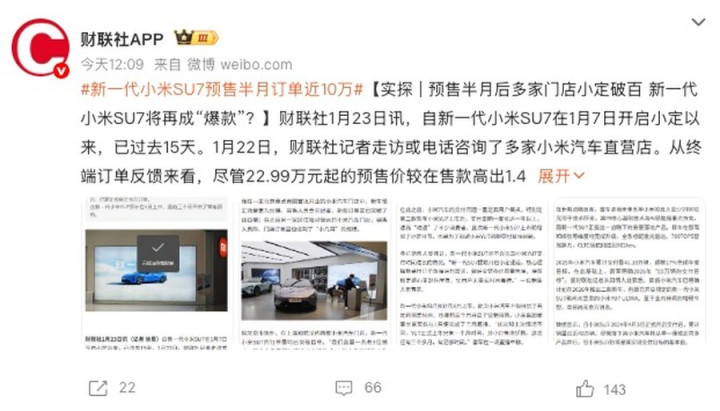 有媒体走访全国多地小米汽车门店后发现,新一代小米SU7的到店咨询量与订单量均表现抢眼。北京一家核心商圈门店的销售透露,目前该门店新车订单量已突破400单;上海、武汉两地的两家门店,订单量也均突破百单,其中上海某门店更是出现“每位销售手中都有超过10个订单”的盛况。按照小米汽车目前全国477家门店的规模粗略估算,自1月7日开启小订以来,新一代小米SU7累计订单量已接近10万单,充分彰显了消费者对这款升级旗舰的认可。