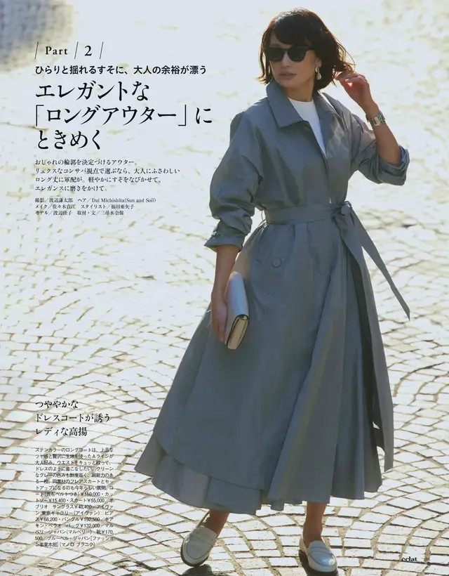 或是遴荐高腰收腰款的灰色风衣外衣,下装遴荐一条同色系的伞状半身裙,脚穿白色乐福鞋,和内搭的白 T 恤酿成色调呼应,让举座配色变得更合营,找到了一个均衡点。