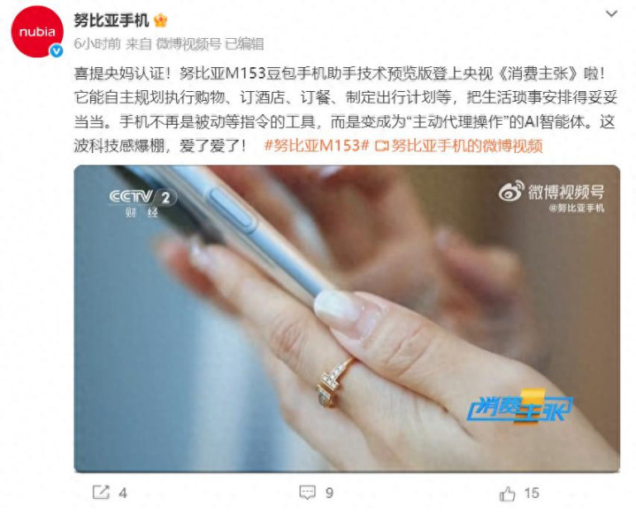 1月23日消息,日前努比亚手机官方微博发布信息称,努比亚M153豆包手机助手技术预览版在央视财经频道《消费主张》栏目中亮相。